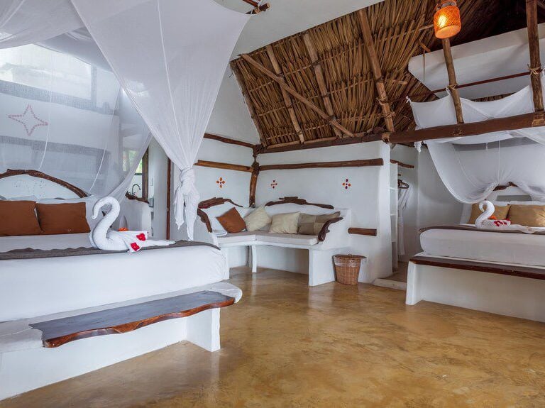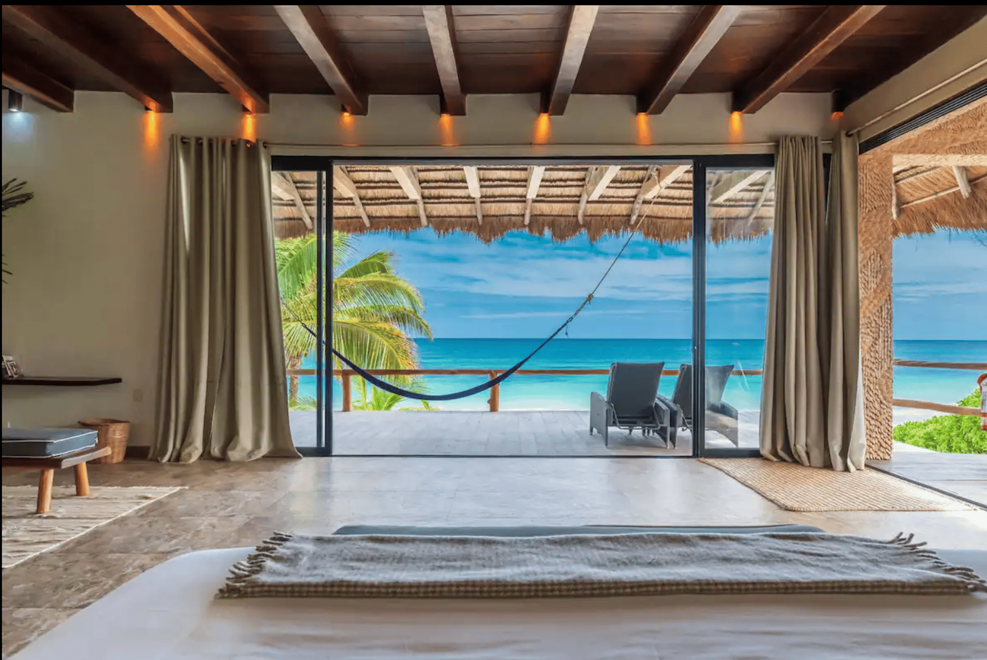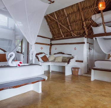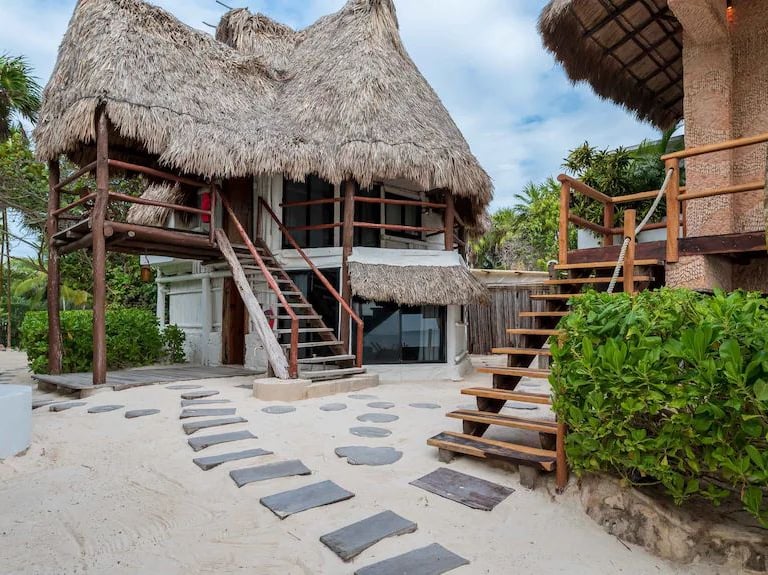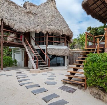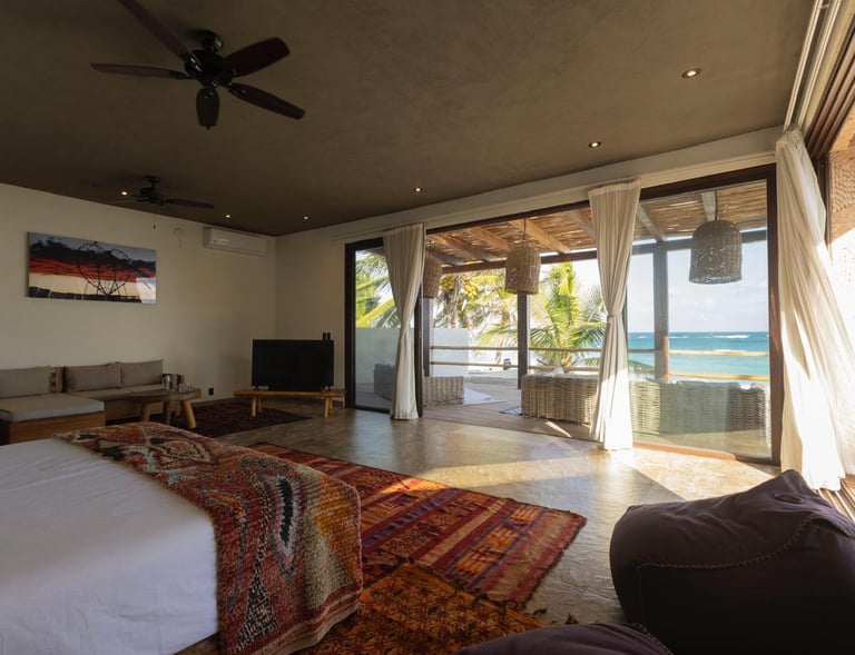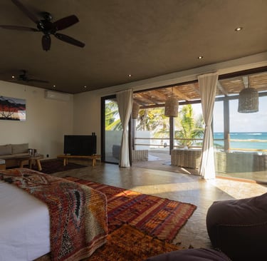 El dormitorio principal está ubicado en el piso superior de la casa principal con una cómoda cama tamaño King, baño privado, luminoso y espacioso, aire acondicionado completo, armario, pequeña sala de estar y una espectacular terraza frente a la playa que permite despertarse todos los días a la hermosa vista al mar de Tulum. Justo enfrente del patio puedes sumergirte en una piscina con vistas al mar.