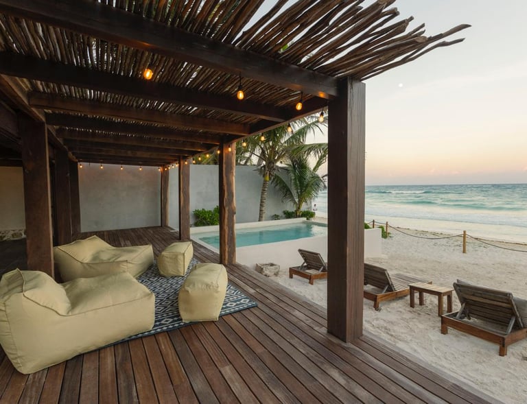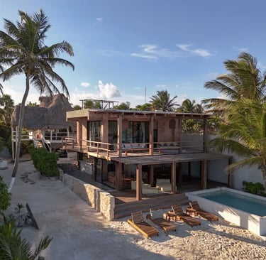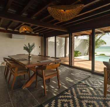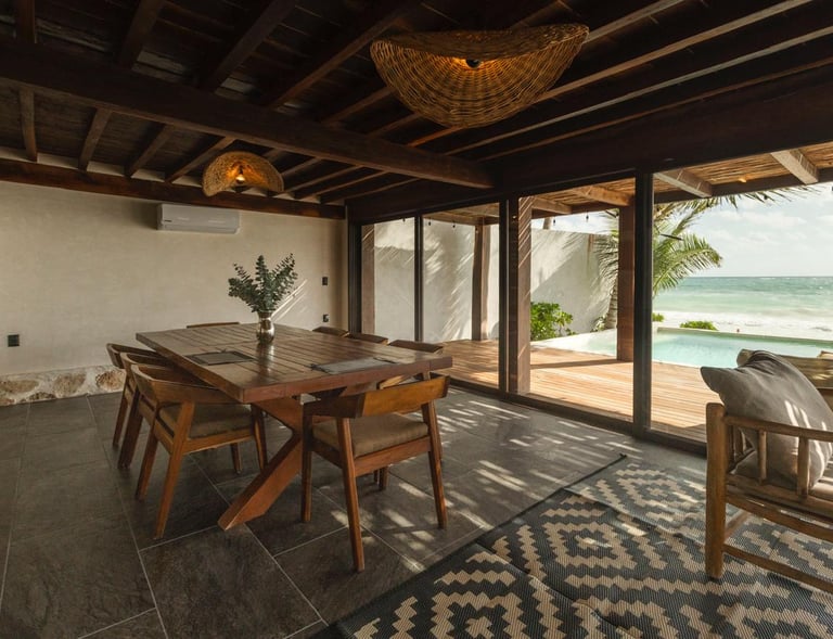 Casa Aakbal - Luxury Beach Front Villa está en Tulum y cuenta con vistas al mar, piscina al aire libre, zona de playa privada, terraza y bar. El alojamiento cuenta con aire acondicionado, zona de estar, zona de comedor, cocina y baño privado.